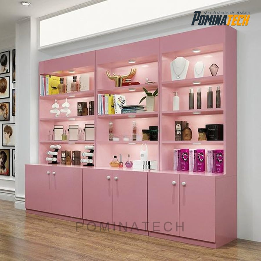 Tủ Trưng Bày Mỹ Phẩm Gỗ MDF Màu Hồng Sang Trọng – Thiết Kế Tinh Tế, Đèn LED Hiện Đại