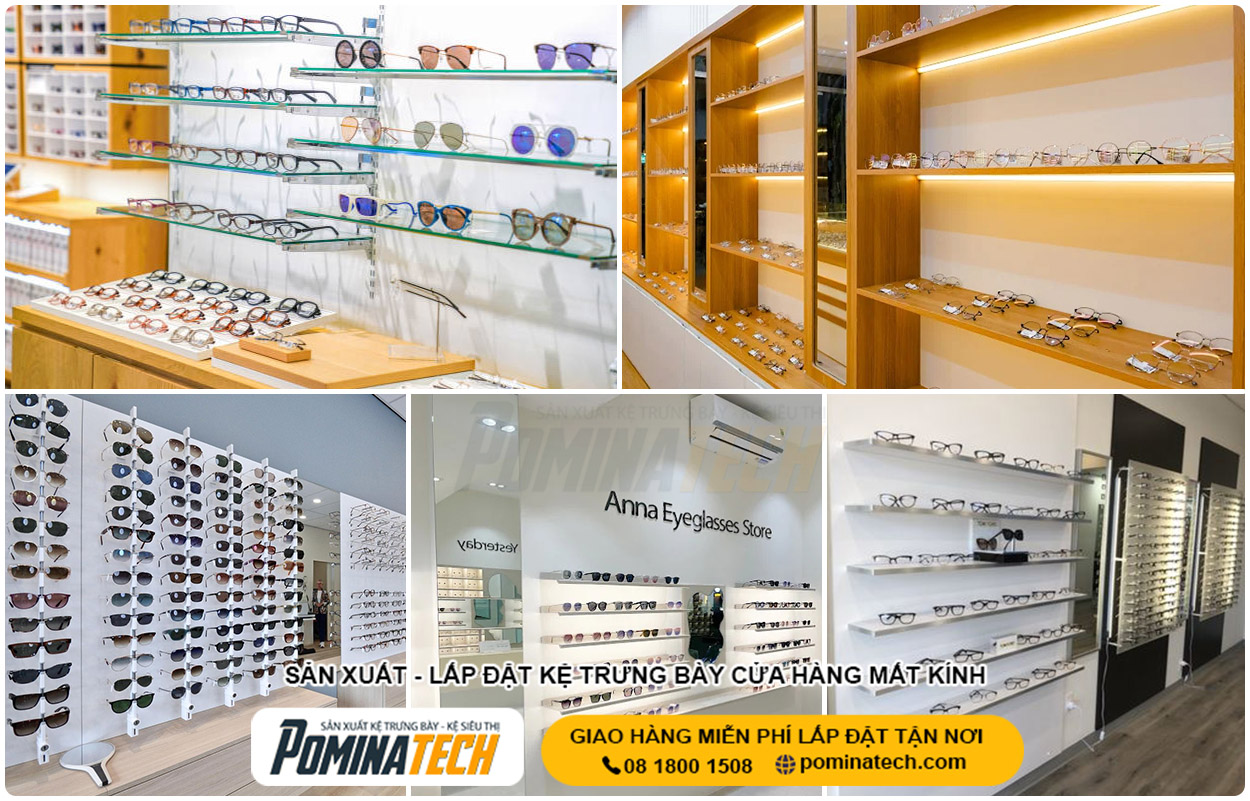 Kệ trưng bày là yếu tố không thể thiếu trong Thiết Kế Cửa Hàng Mắt Kính. Các mẫu kệ chuyên dụng giúp trưng bày kính gọn gàng, tránh trầy xước và tăng giá trị sản phẩm. Vật liệu thường dùng là gỗ MDF, kim loại sơn tĩnh điện kết hợp kính cường lực. Thiết kế kệ cần hài hòa với tổng thể không gian cửa hàng. POMINATECH trực tiếp thiết kế và thi công kệ theo yêu cầu thực tế.