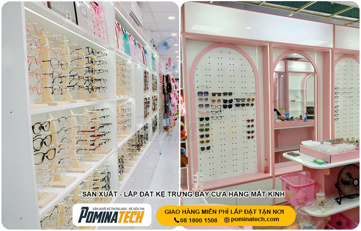 Một cửa hàng sáng sủa, gọn gàng và hợp phong thủy sẽ tạo cảm giác tin cậy cho khách hàng. Ánh sáng trắng chuẩn, bố trí hợp lý giúp khách dễ dàng quan sát chi tiết kính và cảm nhận chất lượng sản phẩm. Pominatech thiết kế nguồn sáng phù hợp từng khu vực, đảm bảo không gian luôn rực rỡ nhưng dịu mắt, giúp khách thoải mái trải nghiệm và tăng tỷ lệ mua hàng.