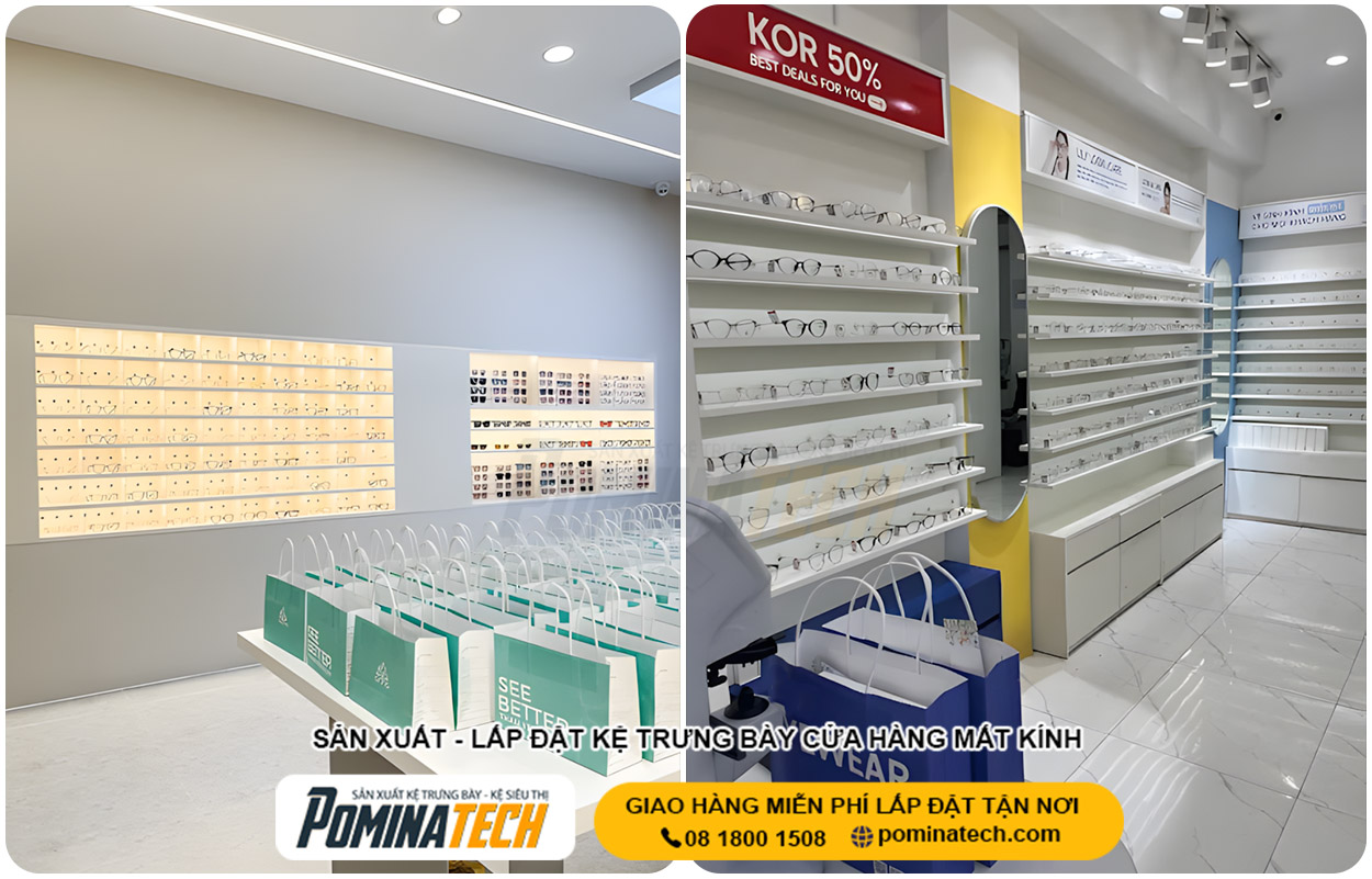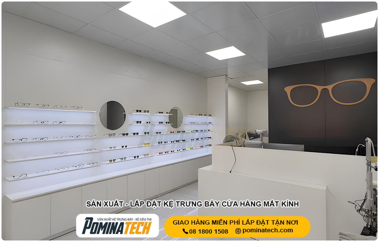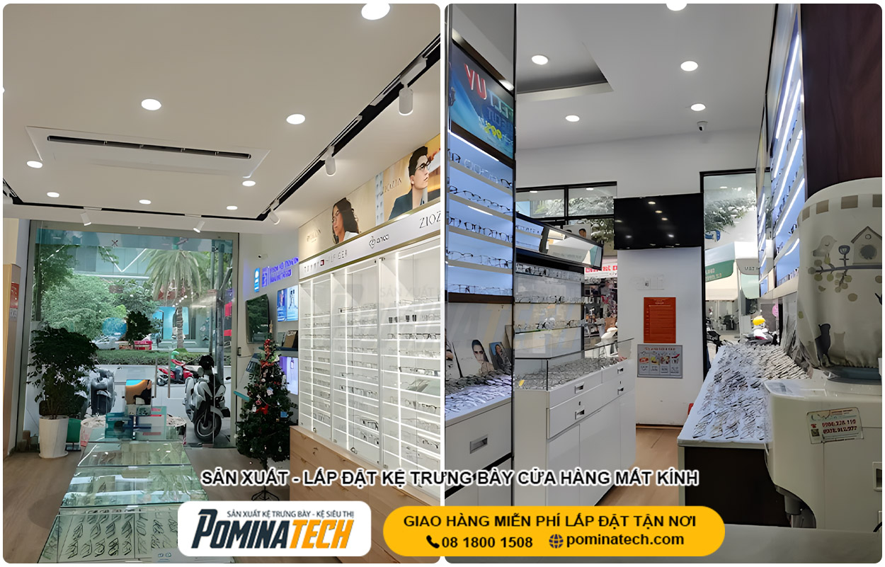 Kệ tủ kính là lựa chọn quan trọng cho cửa hàng muốn hướng đến phong cách sang trọng. Pominatech sử dụng kính cường lực kết hợp đèn rọi điểm, giúp khách dễ quan sát và tăng trải nghiệm mua sắm. Tủ kính bảo vệ sản phẩm khỏi bụi và va đập, tạo cảm giác chuyên nghiệp. Trong Thiết Kế Thi Công Cửa Hàng Mắt Kính Tại Thuận Lợi Đồng Nai, tủ kính được thiết kế linh hoạt theo diện tích, nâng cao trải nghiệm khách và tăng tỷ lệ chốt đơn.