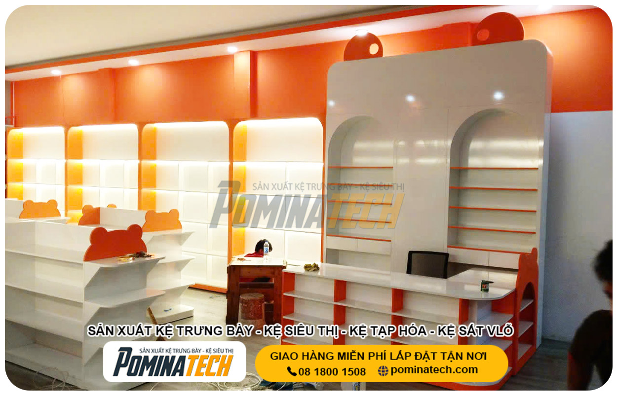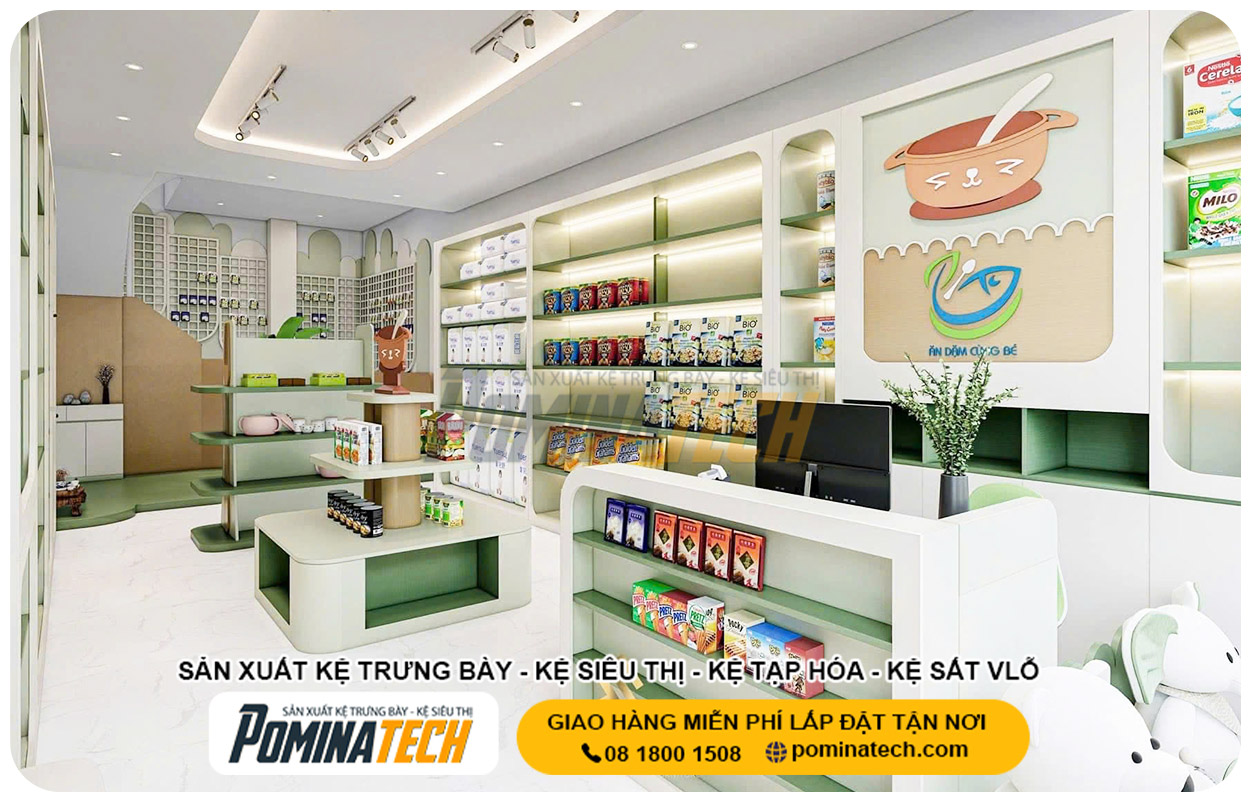 POMINATECH thiết kế – thi công các mẫu kệ trưng bày dành cho cửa hàng mẹ và bé với phong cách an toàn – mềm mại – thân thiện. Kệ được sản xuất với bo góc chống va chạm, màu sắc tươi sáng và chất liệu an toàn, phù hợp với cửa hàng mẹ và bé. Không gian cửa hàng được bố trí khoa học, giúp các mẹ dễ tìm sản phẩm, bé cảm thấy thoải mái, và tổng thể cửa hàng trở nên ấm áp, dễ thương và gần gũi hơn.