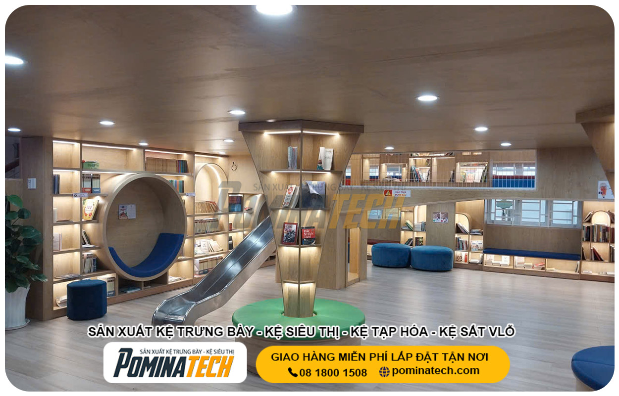 POMINATECH là xưởng chuyên sản xuất kệ trưng bày cho nhà sách, cung cấp đầy đủ các mẫu kệ sách đứng, kệ nghiêng, kệ trưng bày văn phòng phẩm và hệ thống tủ trưng bày theo từng khu vực. Với khả năng thiết kế – thi công trọn gói, POMINATECH giúp không gian nhà sách trở nên khoa học, rộng thoáng và tối ưu khả năng trưng bày số lượng lớn sách vở nhưng vẫn đảm bảo tính thẩm mỹ. Bố cục được sắp xếp hợp lý giúp khách hàng dễ tìm kiếm sản phẩm và mang lại trải nghiệm mua sắm tiện lợi hơn.