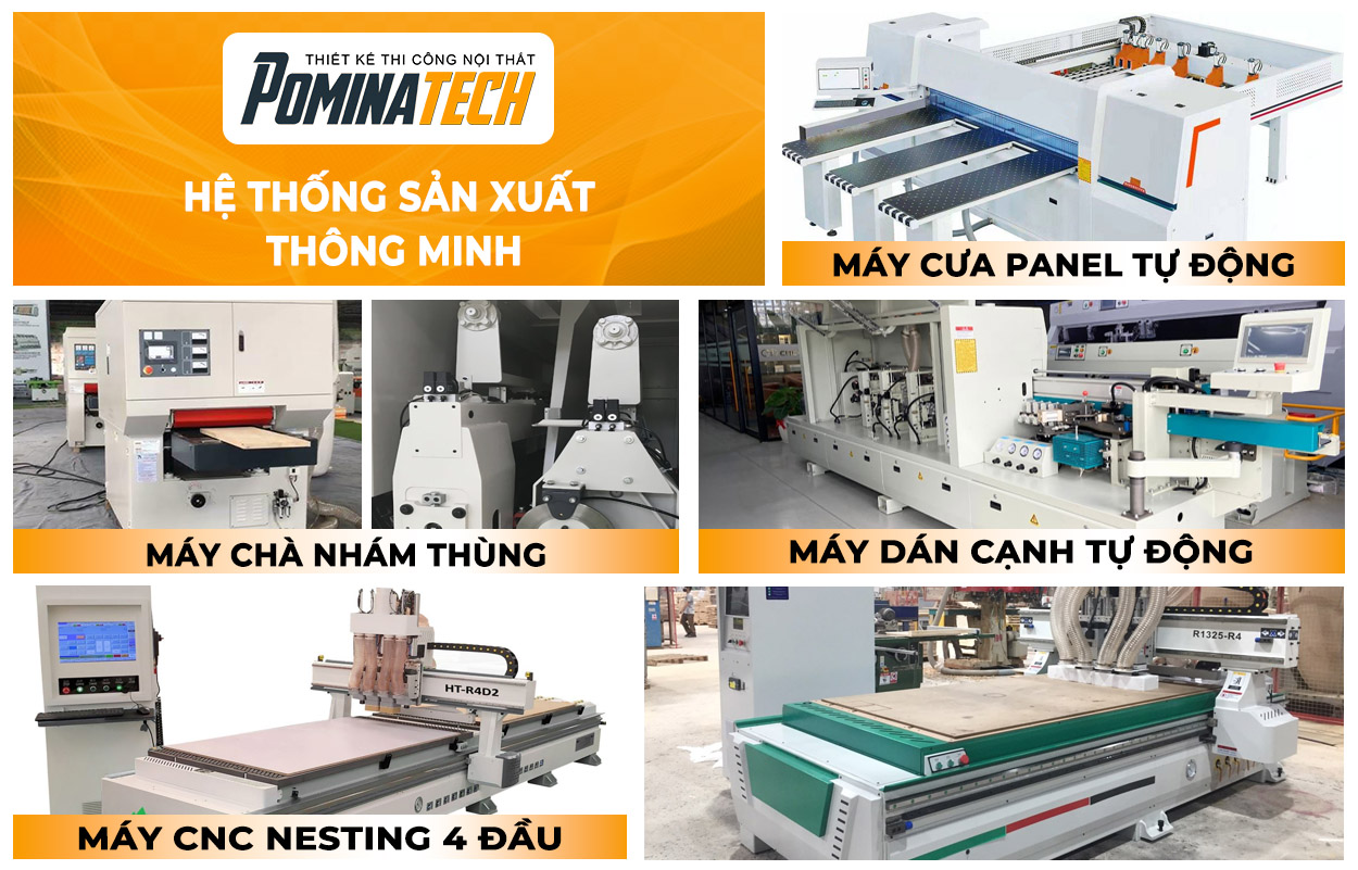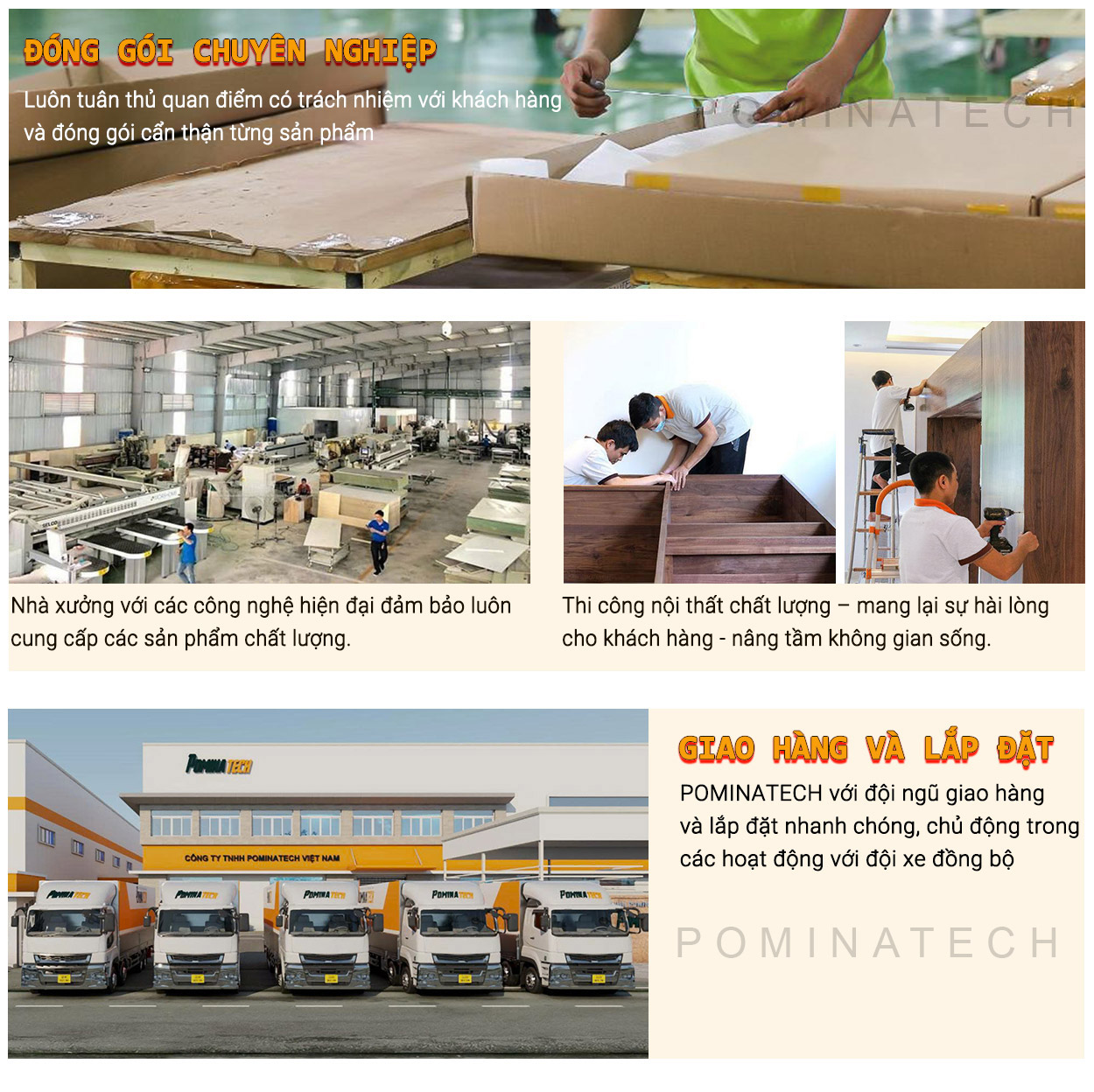 Toàn bộ sản phẩm nội thất được sản xuất trực tiếp tại xưởng POMINATECH bằng máy móc CNC hiện đại, công nghệ dán cạnh, sơn phủ tiên tiến. Điều này giúp sản phẩm đạt độ chính xác cao, bền chắc và thẩm mỹ. Sau khi hoàn thiện, sản phẩm sẽ được kiểm duyệt chất lượng kỹ càng trước khi vận chuyển và lắp đặt tại công trình. Quá trình thi công luôn tuân thủ bản vẽ thiết kế đã thống nhất với khách hàng.