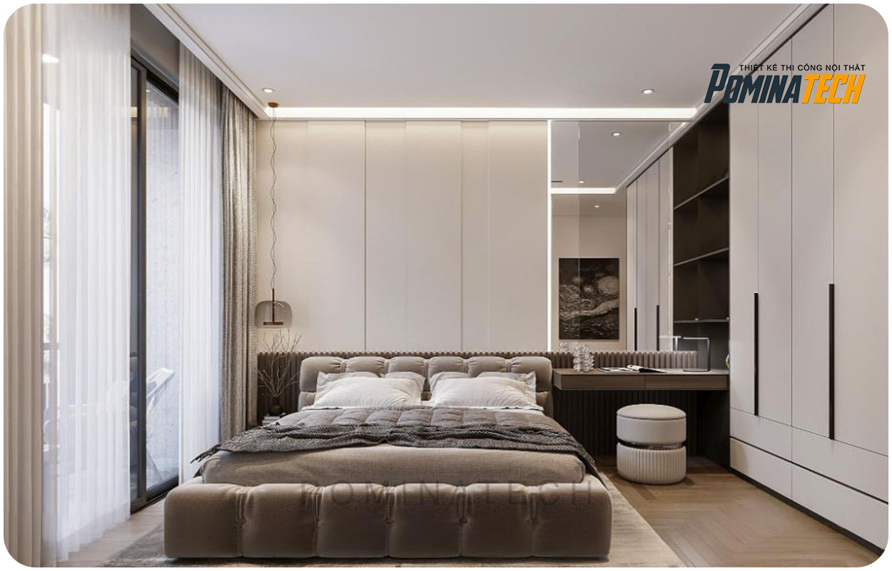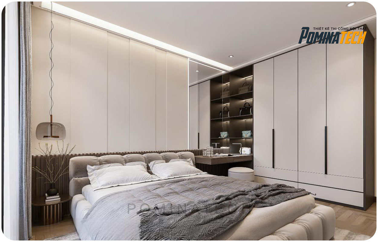Nội thất phòng ngủ được chú trọng cả về công năng lẫn thẩm mỹ. Bao gồm giường ngủ, tủ quần áo, bàn trang điểm, tab đầu giường, tất cả được thiết kế tối ưu diện tích, tạo sự thoải mái và thư giãn. Đặc biệt, tủ quần áo âm tường hoặc cửa lùa giúp tiết kiệm diện tích, phù hợp với không gian căn hộ nhỏ.